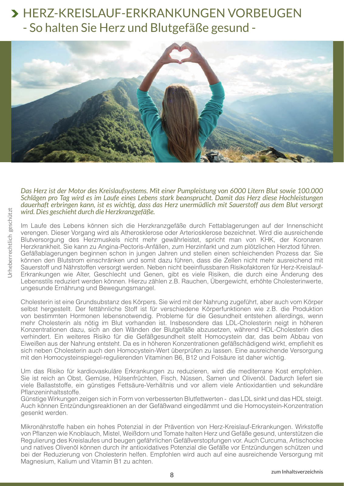 8 zum Inhaltsverzeichnis U rh eb er re ch tl ic h g es ch üt zt Das Herz ist der Motor des Kreislaufsystems Mit einer Pumpleistung von 6000 Litern Blut sowie 100 000 Schlägen pro Tag wird es im Laufe eines Lebens stark beansprucht Damit das Herz diese Hochleistungen dauerhaft erbringen kann ist es wichtig dass das Herz unermüdlich mit Sauerstoff aus dem Blut versorgt wird Dies geschieht durch die Herzkranzgefäße Im Laufe des Lebens können sich die Herzkranzgefäße durch Fettablagerungen auf der Innenschicht verengen Dieser Vorgang wird als Atherosklerose oder Arteriosklerose bezeichnet Wird die ausreichende Blutversorgung des Herzmuskels nicht mehr gewährleistet spricht man von KHK der Koronaren Herzkrankheit Sie kann zu Angina Pectoris Anfällen zum Herzinfarkt und zum plötzlichen Herztod führen Gefäßablagerungen beginnen schon in jungen Jahren und stellen einen schleichenden Prozess dar Sie können den Blutstrom einschränken und somit dazu führen dass die Zellen nicht mehr ausreichend mit Sauerstoff und Nährstoffen versorgt werden Neben nicht beeinflussbaren Risikofaktoren für Herz Kreislauf Erkrankungen wie Alter Geschlecht und Genen gibt es viele Risiken die durch eine Änderung des Lebensstils reduziert werden können Hierzu zählen z B Rauchen Übergewicht erhöhte Cholesterinwerte ungesunde Ernährung und Bewegungsmangel Cholesterin ist eine Grundsubstanz des Körpers Sie wird mit der Nahrung zugeführt aber auch vom Körper selbst hergestellt Der fettähnliche Stoff ist für verschiedene Körperfunktionen wie z B die Produktion von bestimmten Hormonen lebensnotwendig Probleme für die Gesundheit entstehen allerdings wenn mehr Cholesterin als nötig im Blut vorhanden ist Insbesondere das LDL Cholesterin neigt in höheren Konzentrationen dazu sich an den Wänden der Blutgefäße abzusetzen während HDL Cholesterin dies verhindert Ein weiteres Risiko für die Gefäßgesundheit stellt Homocystein dar das beim Abbau von Eiweißen aus der Nahrung entsteht Da es in höheren Konzentrationen gefäßschädigend wirkt empfiehlt es sich neben Cholesterin auch den Homocystein Wert überprüfen zu lassen Eine ausreichende Versorgung mit den Homocysteinspiegel regulierenden Vitaminen B6 B12 und Folsäure ist daher wichtig Um das Risiko für kardiovaskuläre Erkrankungen zu reduzieren wird die mediterrane Kost empfohlen Sie ist reich an Obst Gemüse Hülsenfrüchten Fisch Nüssen Samen und Olivenöl Dadurch liefert sie viele Ballaststoffe ein günstiges Fettsäure Verhältnis und vor allem viele Antioxidantien und sekundäre Pflanzeninhaltsstoffe Günstige Wirkungen zeigen sich in Form von verbesserten Blutfettwerten das LDL sinkt und das HDL steigt Auch können Entzündungsreaktionen an der Gefäßwand eingedämmt und die Homocystein Konzentration gesenkt werden Mikronährstoffe haben ein hohes Potenzial in der Prävention von Herz Kreislauf Erkrankungen Wirkstoffe von Pflanzen wie Knoblauch Mistel Weißdorn und Tomate halten Herz und Gefäße gesund unterstützen die Regulierung des Kreislaufes und beugen gefährlichen Gefäßverstopfungen vor Auch Curcuma Artischocke und natives Olivenöl können durch ihr antioxidatives Potenzial die Gefäße vor Entzündungen schützen und bei der Reduzierung von Cholesterin helfen Empfohlen wird auch auf eine ausreichende Versorgung mit Magnesium Kalium und Vitamin B1 zu achten HERZ KREISLAUF ERKRANKUNGEN VORBEUGEN So halten Sie Herz und Blutgefäße gesund